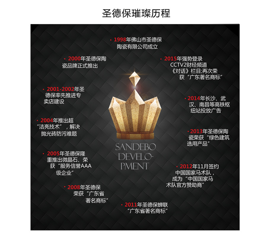 2012年圣德保品牌定位全新升級為“榮耀的傳承者”,2013年簽約國家馬術隊官方贊助商,發布《一起圣德保》MV,2014年全國高鐵樞紐站投放品牌廣告,2015年登陸央視財經頻道《對話》欄目,不斷拓寬圣德保“尊崇榮耀、積極進取、成功自信”品牌理念的傳播渠道。